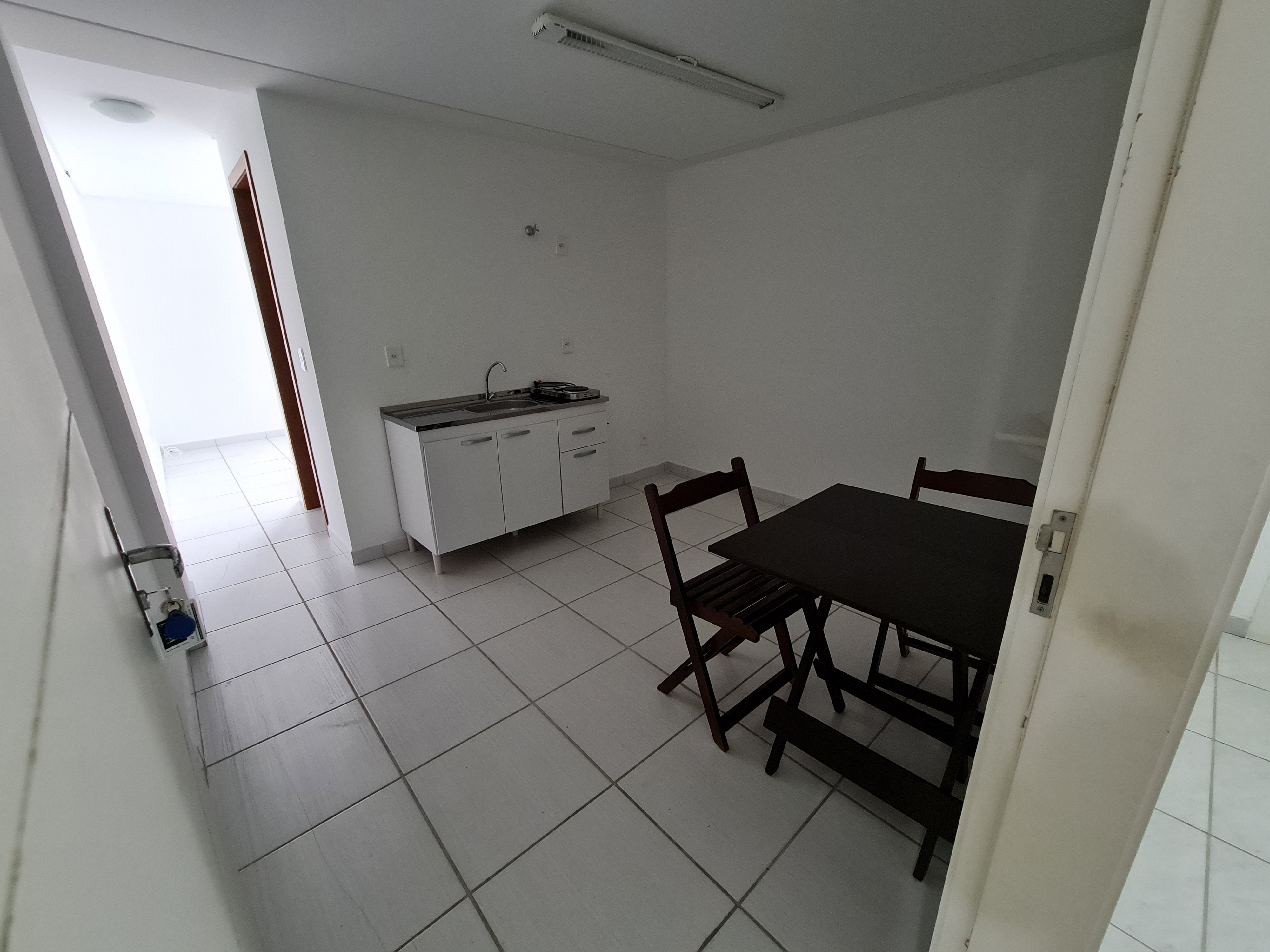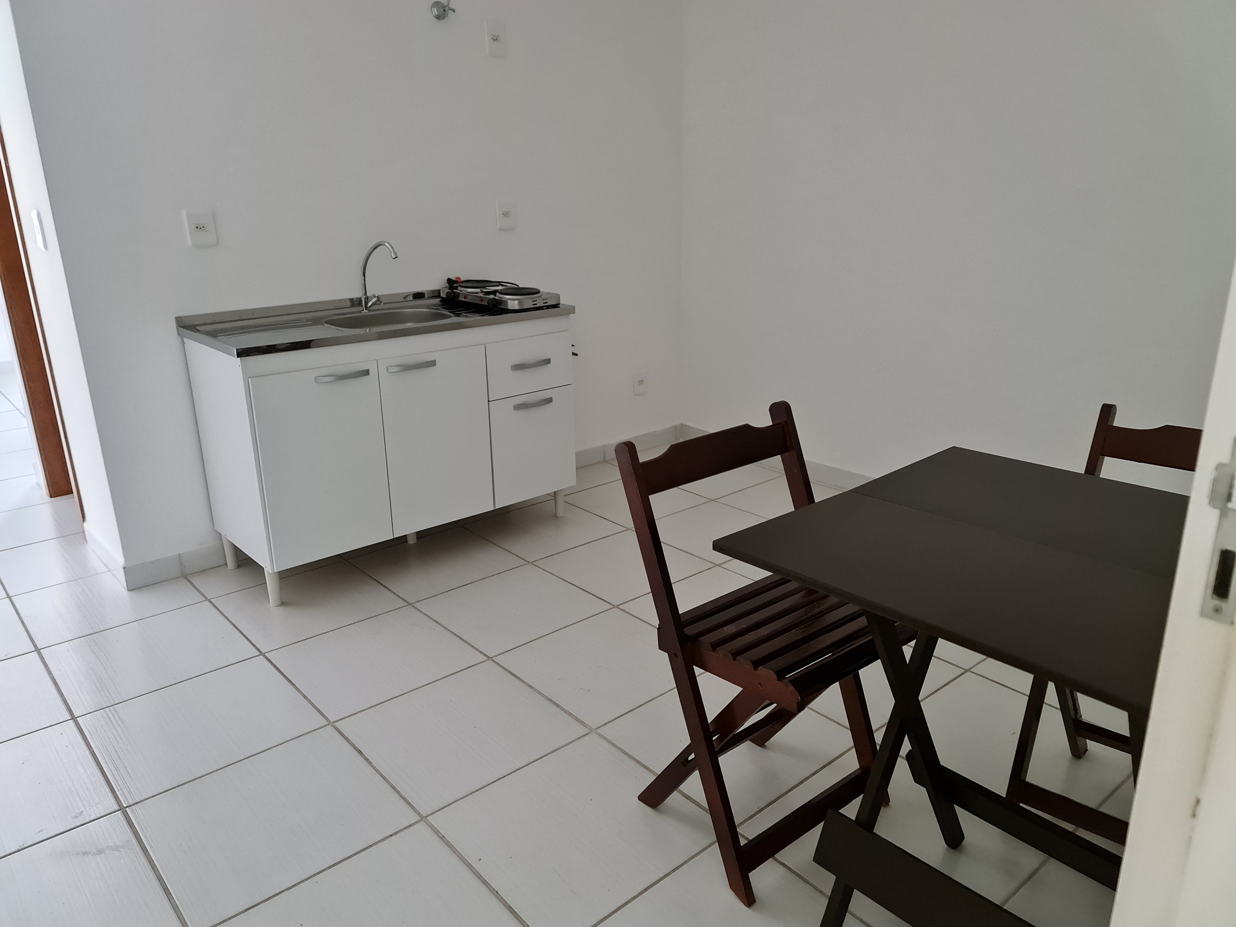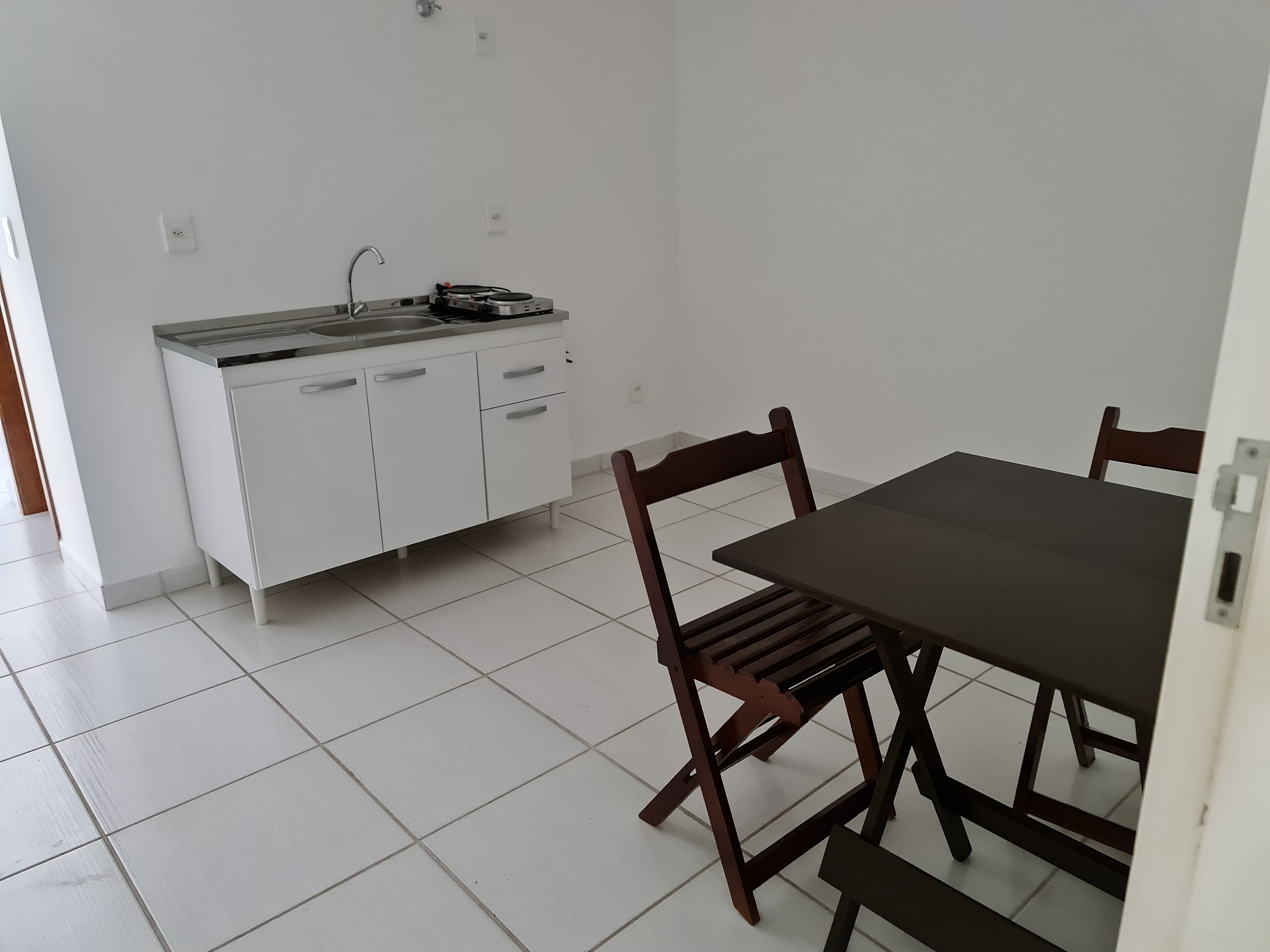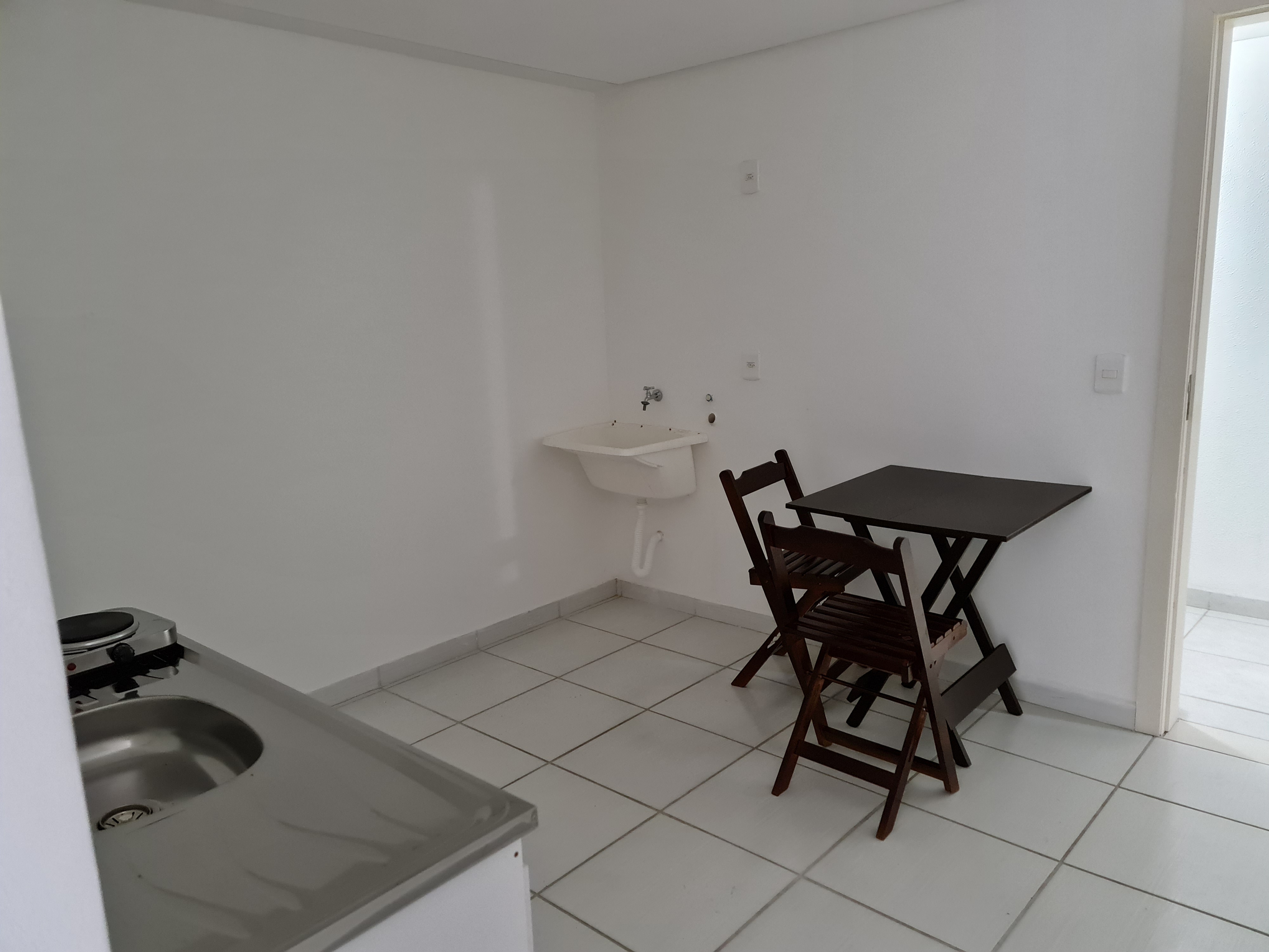 Copa com balcão com pia, mesa com cadeiras e fogão duas bocas elétrico.